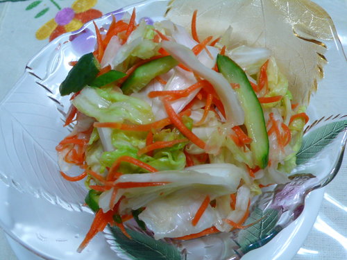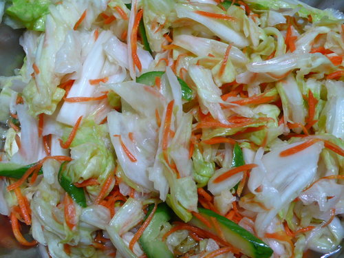 材料:高麗菜半個(洗後剝片)紅蘿蔔一條(刨絲)蒜頭數個(拍碎)小黃瓜一條(剖半斜切片, 紅辣椒粒隨意)