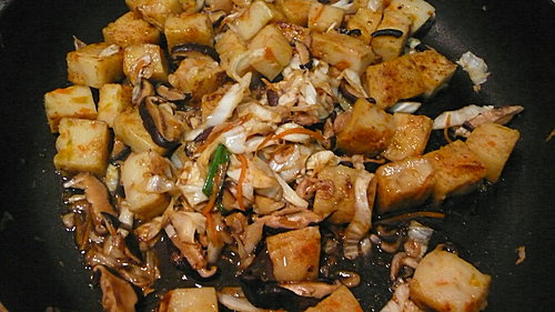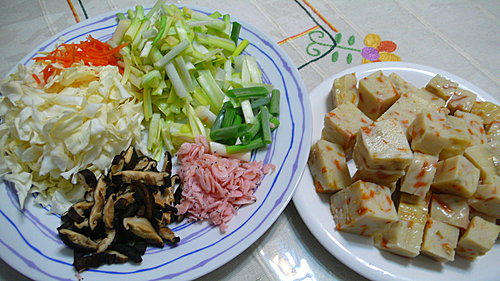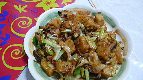 南瓜糕7大片切適口大小.泡軟香菇絲.櫻花蝦.高麗菜絲.紅蘿蔔絲.韭黃段.蔥段各適量
