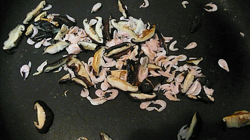 ↑鍋中以油將香菇絲.櫻花蝦炒香