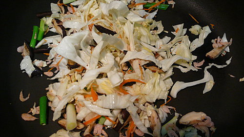 ↑續入蔥段.高麗菜絲.紅蘿蔔絲拌炒