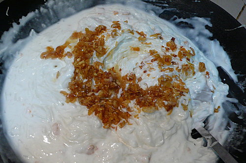 ↑粉漿稍濃稠時加入油蔥酥