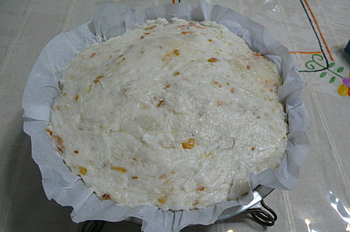 ↑取漏杓狀的容器 上面鋪一張烘焙紙 再將粉漿糰倒入