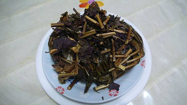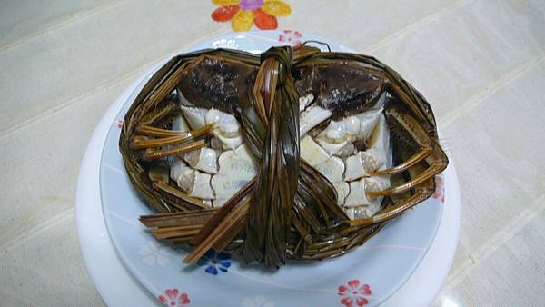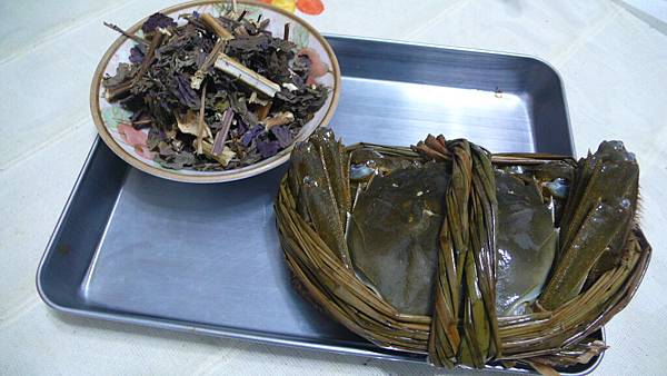 ↑將乾燥紫蘇稍沖洗後放在蟹的上面